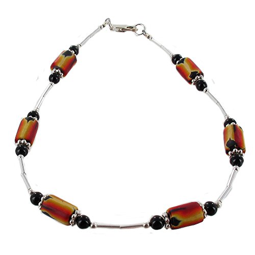 -. Title : Womens Flame Fimo, Black Onyx & Sterling Silver Ladies Beaded Gemstone Anklet with Daisies