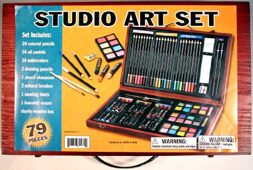 79 Piece compact and portable Art Set to take with you anywhere for hours of satisfying and creative fun. All the art supplies a Beginner or Intermediate artist needs to create their own art. Unlike other Art Sets, the mediums are high quality to make sure you won't be disappointed. Includes: 24 color pencils, 24 oil pastels, 24 watercolor cakes, 2 paint brushes, 2 drawing pencils and accessories. Conforms to ASTM D4236. Non-toxic. Contains small parts, NOT for children under 3 years!Feature