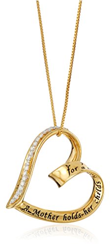 -. Binding : Jewelry -. Brand : Amazon Collection -. Color : Gold -. Department : womens -. Feature : Thoughtful and heartwarming, this diamond-accented heart pendant reminds mothers of the enduring love they share with their children. -.Message stamped on heart reads: "A mother holds her child's hand for a short while and their hearts forever." -.All our diamond suppliers confirm that they comply with the Kimberley Process to ensure that their diamonds are conflict free. -.Imported -.Carat weight listed is the total for all stones. -. Label : LA Rocks -. Manufacturer : LA Rocks -. Model : 447199G -. MPN : 447199G -. PartNumber : 447199G -. ProductGroup : Jewelry -. ProductTypeName : FINENECKLACEBRACELETANKLET -. Publisher : LA Rocks -. Studio : LA Rocks -. Title : Gold-Flashed Sterling Silver Diamond "A Mother Holds Her Child's Hand" Heart Pendant (1/10 cttw, I-J Color, I2-I3 Clarity), 18"