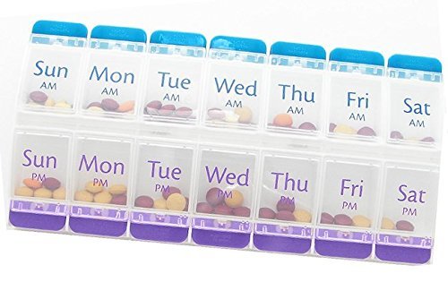 DAY AND NIGHT REMINDERS: 14 clear plastic large compartments for medications taken twice a day, in the morning and in the evening, for 7 days. Labeled with days of week in AM and PM.