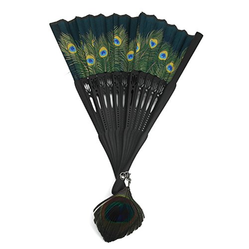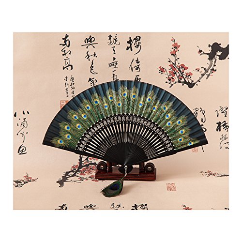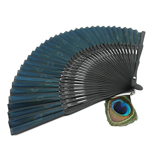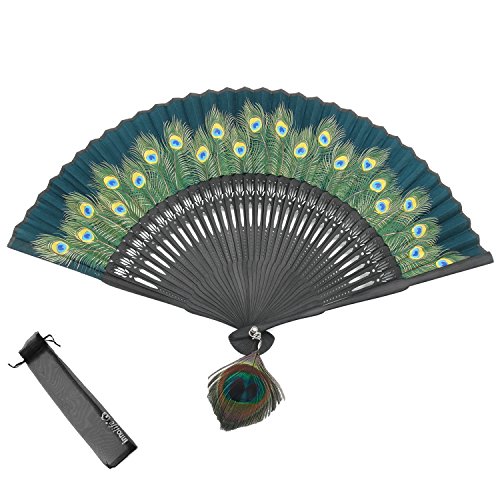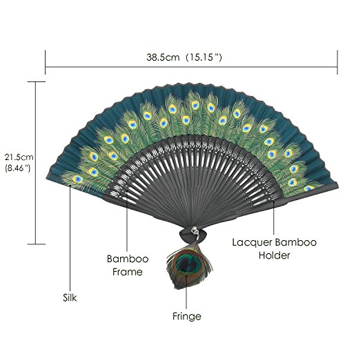 InnoLife - Chinese / Japanese Elegant Peacock Pattern Folding Bamboo Handheld Silk Hand Fan Hand-crafted with Carrying Pouch (Green)