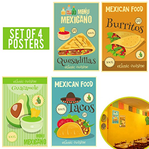 Limited edition: MEXICAN DECOR Set of Four 11x17 - Mexican Restaurant Decor, Food Decoration - Perfect Mexican Party Decorations - Funny Mexican Kitchen Decor.