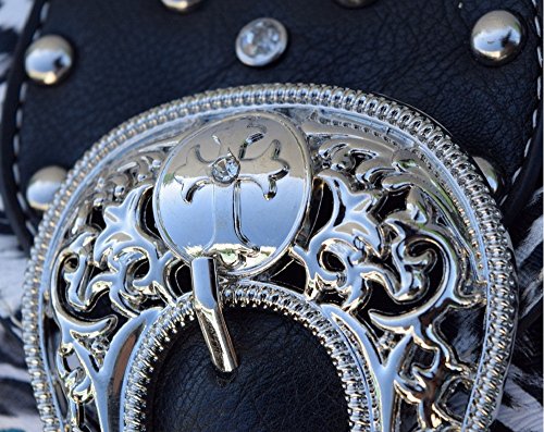 Show off your wild side while carrying your daily essentials in style with this western purse in African white leopard-print. It has a buckle flap covered with studs and silver accents.