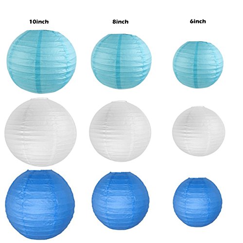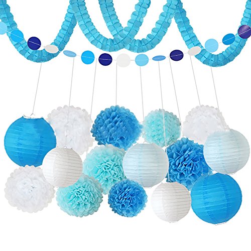- This hanging decoration set includes 9 pcs tissue paper flowers in 3 sizes and 6 pcs paper lanterns in 3 size. It also contained a 10 feet circle dot paper garland (Light blue, white ,Sky blue). Tissue paper flowers have 3 sizes: 6",8" and 10" in 3 different colors:light blue,white and sky blue. Paper lanterns: 2 in white color 6",2 in light blue color 8" and 2 in sky blue color 10". 10 feet circle paper garland in 4 color and 2 set of sky blue fourleaf clover