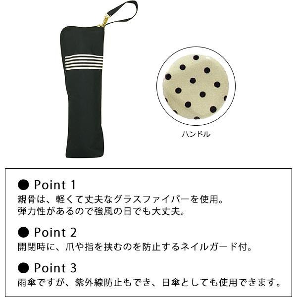 ボーダーテープのリボンがポイントです。ハンドルにもドットがプリントされています。濡れた傘も気にせずカバンにしまうことができる、内生地撥水加工ポーチ付き。 |
