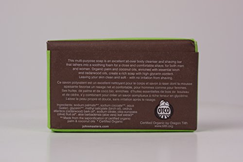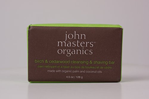 John Masters Organics Birch & Cedarwood Cleansing & Shaving Bar is a soothing, natural soap designed to cleanse and protect skin. This multi-purpose soap is an excellent all-over body cleanser and shaving bar that lathers into a soothing foam for a close and comfortable shave, for both men and women. Certified-organic palm and coconut oils, enriched with the antiseptic properties of essential birch and cedarwood oils, create a rich soap with high glycerin content, leaving your skin clean and soft - with no irritation from shaving. Great for whole body and face. Made for all skin types. Perfect for shaving face and body hair. DIRECTIONS FOR BEST RESULTS: - Wet skin - Apply all over face and body and lather - Shave desired areas and rinse wellFeature