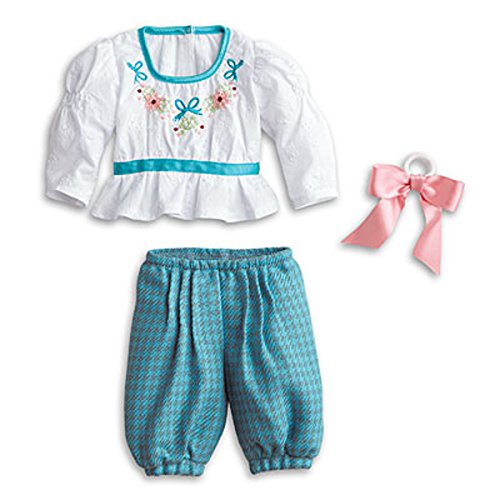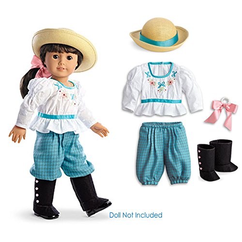 Proper young ladies wore dresses in Samantha’s day—except when they rode bicycles! Samantha loves the freedom of this outfit, which includes: Houndstooth-checked bloomers A pretty white eyelet blouse with long puffed sleeves A wide straw hat with a grosgrain ribbon Removable gaiters to help keep her legs from getting dirty A pink hairbow to pull back her long locks