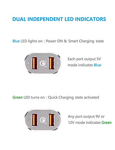 Dual independent LED indicators:Blue LED lights on smart charging; turns Green LED on means quick charging activated.