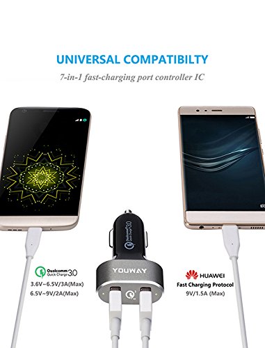 Dual Quick Charge 3.0 ports output:Both ports are supposed to quickly and easily identify your mobile devices, to provide optimal charging efficiency automatically, simultaneously charging any two devices at full speed.