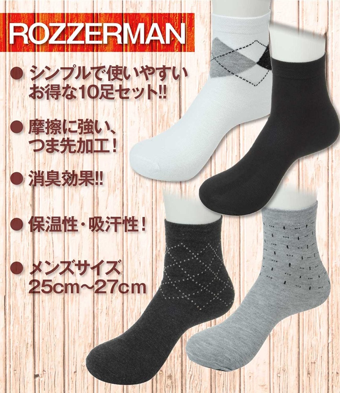 メイン素材: 綿 セット: 2ボックスセット(10足分) 適応サイズ:25~27cm 適用季節:フォーシーズンズ★★ROZZERMANブランド2周年記念価格★★【特徴1】綿製品ですから、消臭、抗菌効果により靴の中イヤなニオイを軽減します。特に消臭効果が抜群であります!【特徴2】肌触り、吸水性、安全性から、お子様やお肌の弱い方にも、喜ばれています。 季節問わず快適にご使用いただけます。【特徴3】シンプルなビジネスソックスで、ビジネス、アウトドア、冠婚葬祭、スポーツ、などにも幅広くご利用いただけます 営業や立ち仕事が多いビジネスマンの方にもおすすめです。