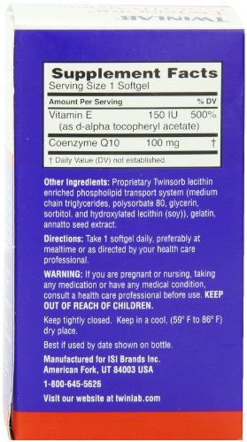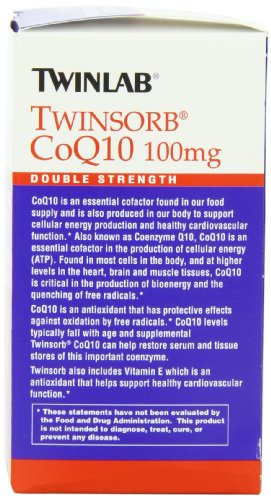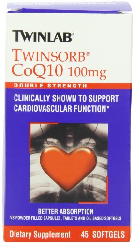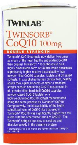 ReleaseDate : 2006-06-15 Studio : Twinlab Publisher : Twinlab Binding : Health and Beauty Product Description Twinsorb CoQ10 softgels now deliver two times as much of the heart healthy antioxidant CoQ10 than original Twinsorb.* It continues to be a highly bio-available delivery form of CoQ10 which possess significantly higher relative bioavailability than powder filled CoQ10 capsules, tablets and oil based softgels. In a published human clinical trial, healthy adults took equal amounts of either a standard softgel capsule containing CoQ10 suspension in oil, powder-filled hardshell CoQ10 capsules, powder?based CoQ10 tablets, or a highly-solubilized CoQ10 softgel manufactured using the same process as Twinsorb CoQ10. Comparatively, the bio-availability of the highly solubilized form of CoQ10 like that used in Twinsorb CoQ10 was significantly higher than the levels with the other three forms of CoQ10 0