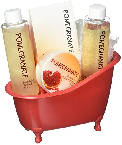- The Bath Pomegranate Spa Set comes in a red plastic, vintage-style bathtub. The red coloring emulates energy and youthfulness. The spa set with the bathtub holder is a 2-in-1 gift that that can be used for display, as a quirky element in an elegant bathroom!