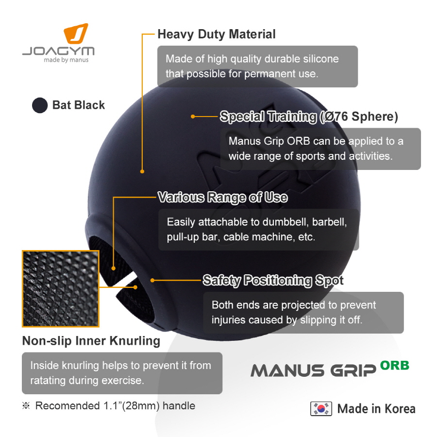 オルビーグリッププロは一般マヌスと異なり丸い形のファットグリップ(FatGrip)アダプターです。指をはじめと握力の発達に優れた製品であり、さまざまな球技の訓練に使用されています。