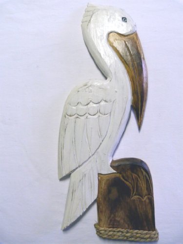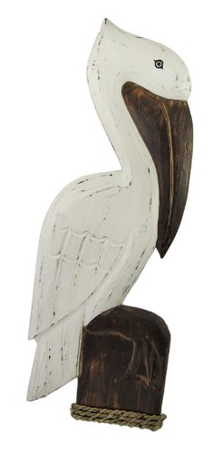This wooden wall plaque is a wonderful accent to any home, porch, or bar with a beach or nautical theme! It features a white pelican atop a piling and measures 24 1/4 inches tall, 8 1/2 inches wide, and 1 inch deep. It is hand painted, and the twisted sea grass rope adds a bit of extra texture. The plaque easily mounts to the wall with a single nail or screw, and is sure to be admired.