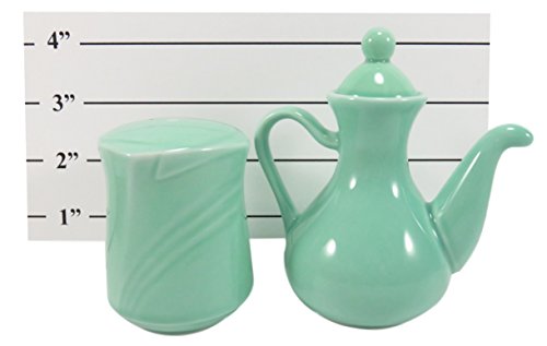 THE SPECIFICS: Set of three: one salt and pepper shaker set (3" x 2.5") with one soy sauce container (4.5" x 4") in seafoam green.