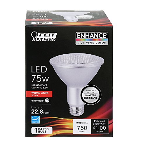 Studio : Feit Electric Inc. Publisher : Feit Electric Inc. Binding : Tools Home Improvement Product Description The Feit Electric high-CRI dimmable Enhance LED PAR30L Reflector Spot bulb is specifically designed to facilitate a home's transition into the cutting edge performance and quality of LED light bulb that meets the latest Title 24 requirements of the California Energy Commission. It has a CRI of 90 and an average life of 25,000-hours. The Feit Electric 75-Watt equivalent PAR30L LED is warm white, fully dimmable and is great for security, recessed and track lighting applications. Featuring a sleek design, this fully dimmable, medium base spot light replaces your current PAR30L. 0