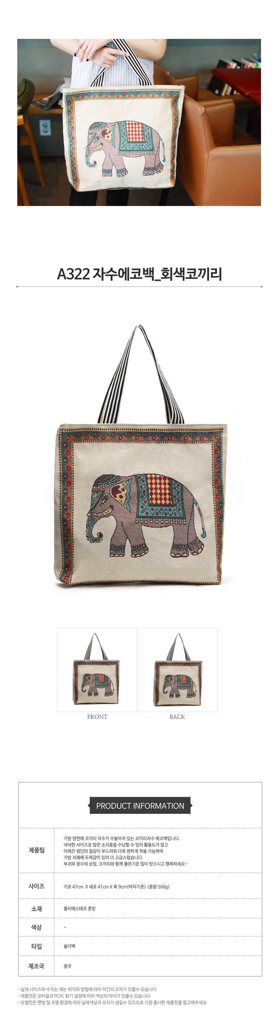 Cross Back Fashion Bag Embroidery Eco Bag Gray Elephant A322 Casual Backpack Bag