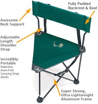 - Feature : Patented Auto-FoldTM Technology shoulder strap for easy opening, closing and carrying / Unit weight: 4 lbs., Supports 250 lbs. / Padded backrest and seat, Powder-coated steel with 600 denier polyester / Beverage holder / Open size: 27" x 18.2" x 14", Folded size: 27" x 5" x 6"