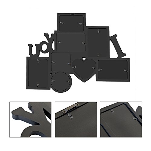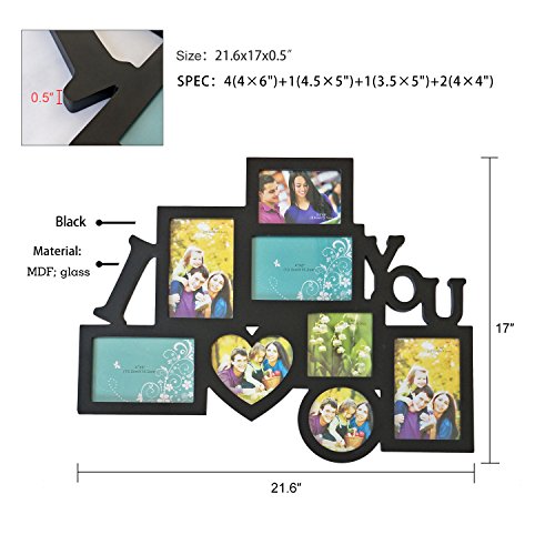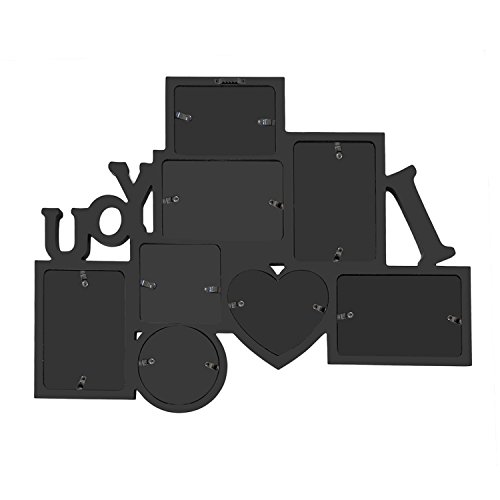 If a picture is worth a thousand words, then the meaning of this frame is abundantly clear! This wall hanging combines the words "I (Heart) You" in attractive, white block print with space for eight black-framed images. In addition to four 4x6" and one 4.5x5" rectangles, fill circle, heart, and square frames as well. This is a lovely birthday or anniversary gift for anyone you love, and a great statement piece in any room. Showcase your favourite moments and your favourite people with the photo frame that says it all!o frame that says it all!.Feature