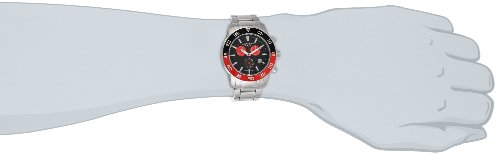 -. Feature : Chronograph features include 60 second, 30 minute timer, and day sub dials / Date displayed at the 4 o'clock position / Silver-tone, stainless steel, bracelet and case with a Red and Black bezel / Swiss Quartz Chronograph movement / Water-resistant to 30 M (99 feet) / Chronograph features include 60 second, 30 minute timer, and day sub dials / Date displayed at the 4 o'clock position / Silver-tone, stainless steel, bracelet and case with a Red and Black bezel / Swiss Quartz Chronograph movement / Water resistant to 99 feet (30 M): withstands rain and splashes of water, but not showering or submersion
