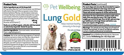 -. Binding : Misc. -. Brand : Pet Wellbeing -. EAN : 0661822600153 -. Feature : Certified organic and ethically wild-harvested: This formula is entirely prepared from organically grown, wild-harvested and selectively imported herbs. We only buy from trusted growers. / Lung Gold is a combination of natural herbal ingredients and Vitamin C designed to help your cat maintain strong immunity in the lower respiratory system. / Lung Gold for Cats Enhances good oxygenation and opens airways. Helps Supports easy breathing and is helpful for productive coughs. It also Provides comfort and relief. / Full Sprectrum Extract: The full biochemical spectrum of the herbs is preserved to ensure the potency of the extract. All raw materials are tested for identification and purity. / FDA Center for Veterinary Medicine Guidelines: PetWellbeing.com complies with the provisions of the CVM's good guidance practices for pet dietary supplements. All ingredients and caution statements adhere to these national guidelines. -. Label : Pet Wellbeing -. Manufacturer : Pet Wellbeing -. Model : FBA_PW 0015-B -. MPN : FBA_PW 0015-B -. PackageQuantity : 1 -. PartNumber : FBA_PW 0015-B -. ProductGroup : Pet Products -. ProductTypeName : PET_SUPPLIES -. Publisher : Pet Wellbeing -. Studio : Pet Wellbeing -. Title : Pet Wellbeing - Lung Gold for Cats - Natural Breathing support for Felines - 2oz (59ml) -. UPC : 661822600153