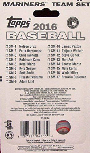 [Product Information]- This is a 2016 Topps Seattle Mariners Factory sealed special edition 17 card team set; cards are numbered SM-1 through SM-7 and are not available in packs. Players included are Nelson Cruz, Feliz Hernandez, Chris Iannetta, Robinson Cano, Ketel Marte, Kyle Seager, Seth Smith, Hisashi Iwakuma, Adam Lind, James Paxton, Taijuan Walker, Steve Cishek, Nori Aoki, Leonys Martin, Nate Karns, Wade Miley and Franklin Gutierrez.