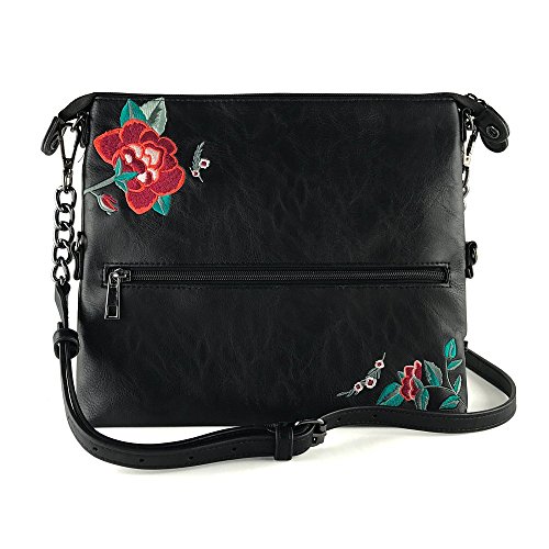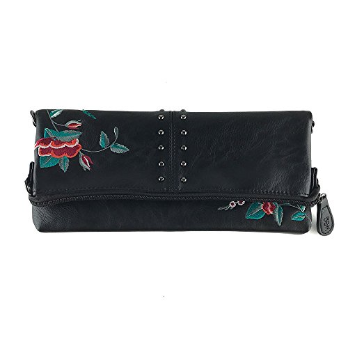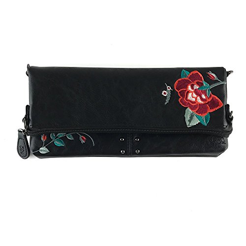 The stevia is a convertible women's handbag that can be worn as either a fold-over clutch or a cross body bag, and comes with adjustable shoulder straps. It is made with premium faux leather, and is designed with studded detail, floral embroidery, and chain detail on the adjustable cross body straps. This black women's cross body bag is the most versatile handbag you will find and converts to 4 styles change your style, your look, your mood, and express yourself without limitations. It is not about you fitting the brand, it is about the brand fitting you. K&Bo was created for you to be yourself. Product details: Premium embroidered faux leather gun metal hardware top zipper closure exterior zipper pocket cross body bag dimensions: 10.5" l x 9" t x 1" d cross body clutch dimensions: 10.5" l x 5.5" t x 2" d adjustable cross body strap length: 35" to 45".Feature