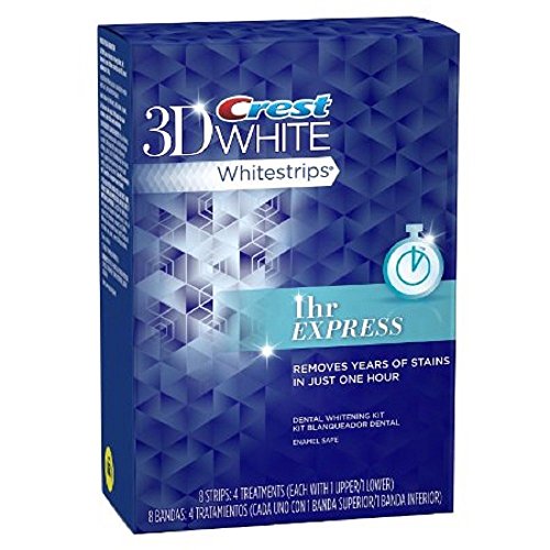 -. Binding : Health and Beauty -. Brand : Crest -. Feature : 8 strips: 4 treatments (each with 1 upper /1 lower)Removes years of teeth stains in just 1 hour for a noticeably whiter smile.Whitens teeth faster than ever, even when there is no time to plan.Advanced Seal Technology, no slip grip stays put so you can talk and drink water while whitening teeth.Uses the same enamel-safe teeth whitening ingredients dentists use. A comfortable, no-hassle home teeth whitening experience -. Label : Crest -. Manufacturer : Crest -. ProductGroup : Beauty -. ProductTypeName : HEALTH_PERSONAL_CARE -. Publisher : Crest -. Studio : Crest -. Title : Crest 3D White Whitestrips Dental Whitening Kit