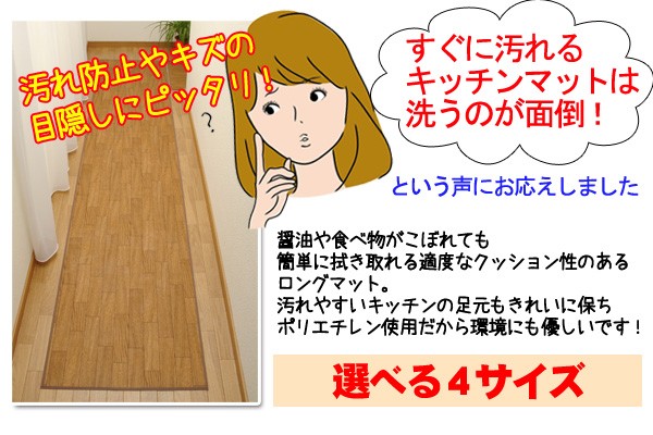 木製のフローリングは、今や人気の床材。しかし、素材が「木」なのでキズが付いたり、水気のものを溢してしまうとヨゴレが付いてしまったり、お掃除が大変です。本品は、そんなフローリングの上に敷く「フローリング調のマット」です。表面がポリエチレン素材なので、食べ物や飲み物を溢してもスグに拭き取れます。厚みはありませんがソフトな感覚の踏み具合。夏場のキッチンマット代用として、または、廊下などのキズ防止用としてご利用ください。