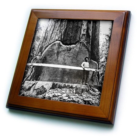 3D Rose Vintage California Loggers Cutting a Giant Sequoia Tree 1917 Redwood Framed Tile, 8" x 8"
