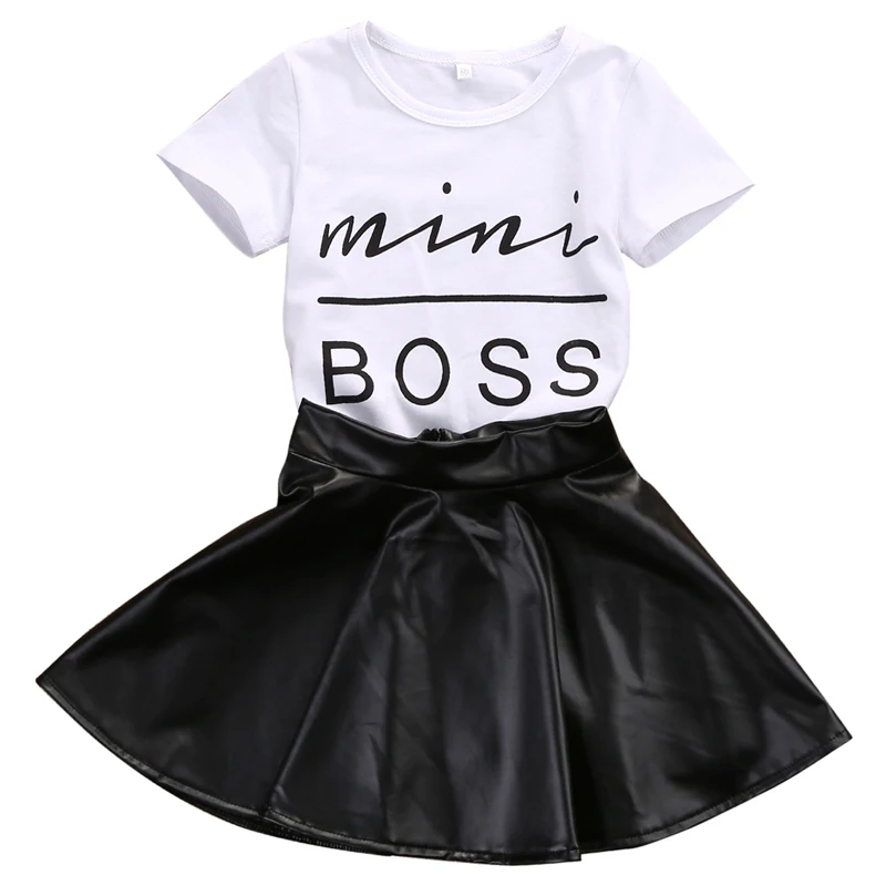 Lovely Toddler Girls Kids Shirt+Faux Leather Skirts Outfits Dress !! High quality and Brand new 100% Main Color: As Picture Show New in Fashion Material: Cotton Blend Attentionplz:Ifyourkidischubby・werecomendchoosingalargersize・thanks. Please kindly refer to your kids actual height and the size chart before buying/bidding. Thanks. Package included: 1x T-shirt + 1x Skirts