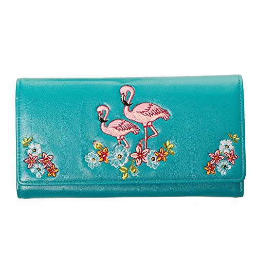 Binding : Apparel Product Description Material: 100% PU, Lining: 100% PVC Dimensions: approx. 19 x 2,5 x 10 cm - embroidered Flamingoes and flowers - two large compartments for bills - zip compartment for coins - 13 card holders, one of which is transparent - two larger compartments for other documents. 0