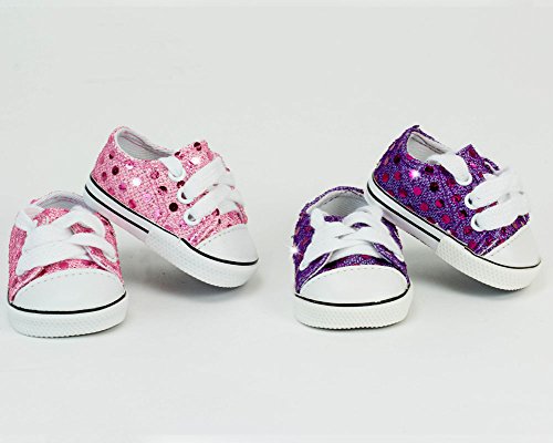 -. Title : 18 Inch Doll Sequin Tennis Shoe Set. Includes Pink & Purple Doll Shoes