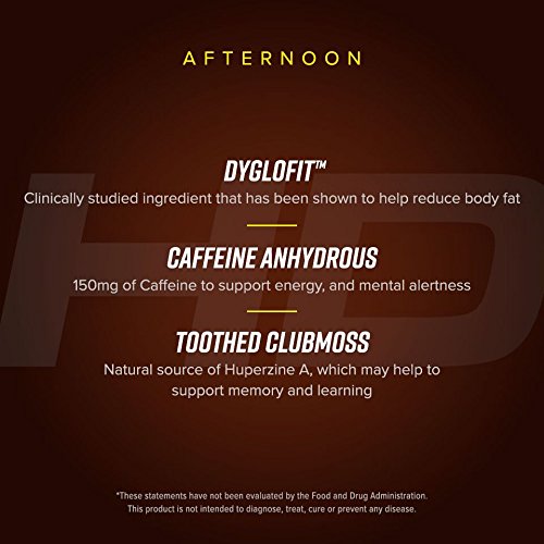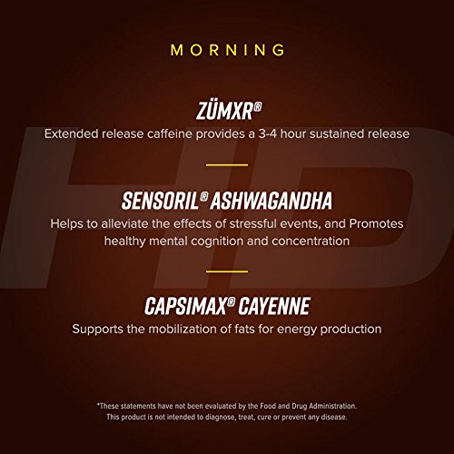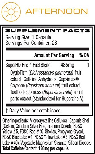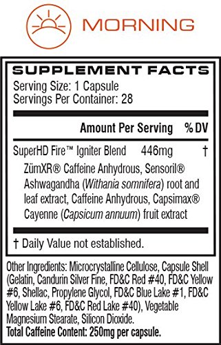 Morning - 446mg SuperHD Fire Igniter Blend, 250mg Caffeine per capsule. Afternoon - 485mg SuperHD Fire Fuel Blend, 150mg caffeine per capsule.