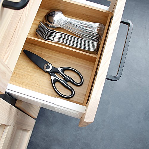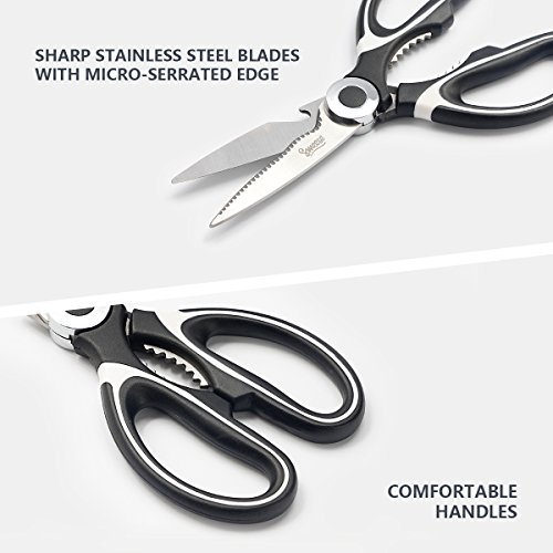 COMFORTABLE GRIP HANDLES - Convenient soft-grip handles don't slide when your hands are wet. It is safe than using a knife on slippery chicken. And high grade rivet avoids the kitchen shears suddenly come apart during utilizing. Safety first!