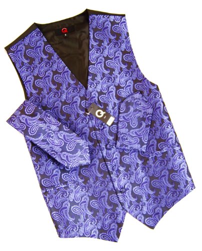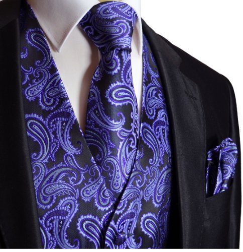 -. Binding : Apparel -. Brand : Vest Set -. Color : Purple -. Department : mens -. Feature : Excellent Quality / Set including: Tuxedo Vest , Necktie and Handkerchief / Strap in the Back to adjust the width / Brand: Brand Q -. ProductGroup : Apparel -. ProductTypeName : SUIT -. Title : Purple and Black Paisley Tuxedo Vest Set