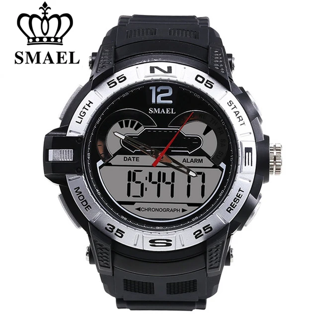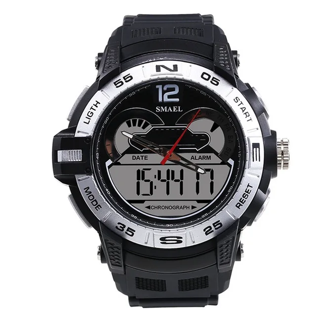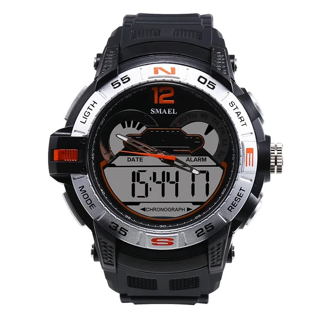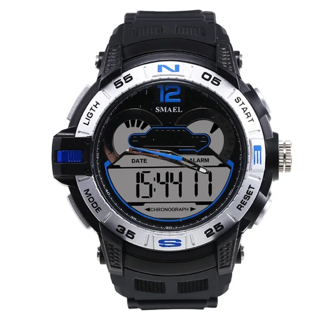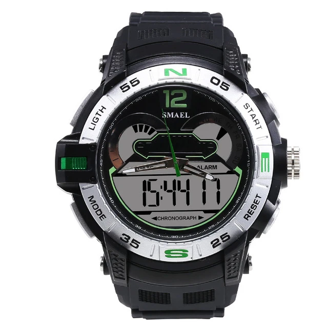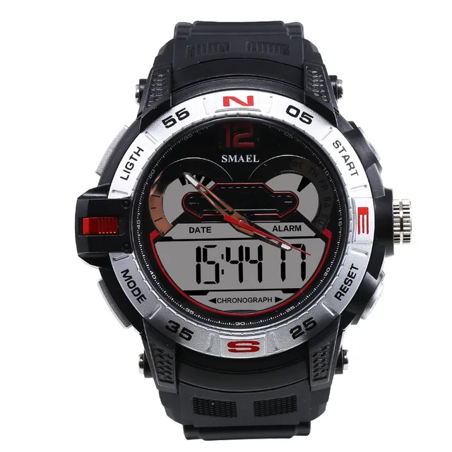 1. 브랜드: SMAEL 2. 듀얼 타임 LED 백라이트 기능 보여줍니다 3. 30 메터 방수, 수 수영. 4. 유형: 남성 스포츠 시계 5. 운동: 일본 원래 디지털 운동 6. 선택 5 색 7. 밴드 폭: (약) 2.1 센치메터 8. 다이얼 직경: (약) 4.8 센치메터 9. 스트랩 소재: 강한 PU 10. 케이스 재질: 강한 고무 + 고강도 강화 유리 11. 걸쇠: 버클 12. 보여주는 정확한 시간