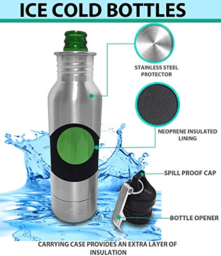 Product Description Wave goodbye to warm beer, ice buckets, and endless trips to the refrigerator! Our beer bottle cooler will keep your beverage ice-cold for longer at home, at parties, or on vacation. Perfect for golfing, fishing, hunting, tailgating, BBQ, beach or any outdoor adventure. The stainless steel bottle holder locks in the crisp coolness of your drink and safeguards against spillage, breakage, and excess moisture. The neoprene sleeve provides added insulation for sub-zero refreshment. Perfect beer gift and bar accessory. Grab our beer bottle cooler for yourself or gift one to an avid beer drinker! 0