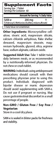 Doctor’s Best SAM-e is proven to enhance mood and promote cognitive health. It is essential for the healthy metabolism of the major brain transmitters’ dopamine, serotonin and norepinephrine. In addition, SAM-e promotes joint comfort and mobility and supports liver health and detoxification. SAM-e effectiveness has been published in 18 controlled human trials published over 40 years. Doctor’s Best SAM-e uses pharmaceutical grade materials. SAM-e is derived from the amino acid methionine and is one of the most important methyl donors in the central nervous system. SAM-e optimized for potency, stability, and to survive the stomach acid and reach the intestine (where it is absorbed). Effectiveness of SAM-e has been backed by at least 18 controlled human trials published over almost four decades.Feature