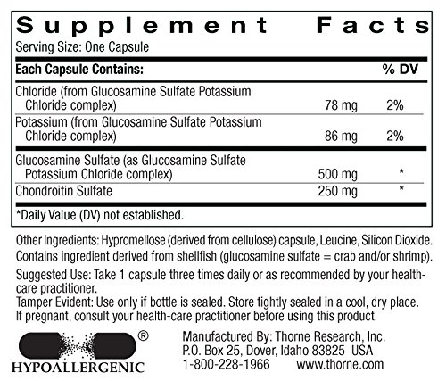 -. Binding : Health and Beauty -. Brand : Thorne Research -. EAN : 0885143989302 -. Feature : Helps maintain healthy joint function and mobility / Supports normal cartilage formation / Glucosamine and chondroitin combination may be of more beneficial than glucosamine alone / Backed by clinical research -. IsAdultProduct : 0 -. Label : SETAF -. LegalDisclaimer : These statements have not been evaluated by the Food & Drug Administration. These products are not intended to diagnose, treat, cure or prevent any disease. -. Manufacturer : SETAF -. Model : SF767 -. MPN : SF767 -. NumberOfItems : 1 -. PackageQuantity : 1 -. PartNumber : SF767 -. ProductGroup : Health and Beauty -. ProductTypeName : HEALTH_PERSONAL_CARE -. PublicationDate : 2015-06-13 -. Publisher : SETAF -. ReleaseDate : 2015-06-10 -. Size : 90 capsules -. Studio : SETAF -. Title : Thorne Research - Glucosamine & Chondroitin - Dietary Supplement to Support Healthy Joint Function and Mobility - 90 Capsules -. UPC : 884953468700