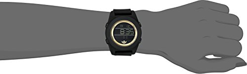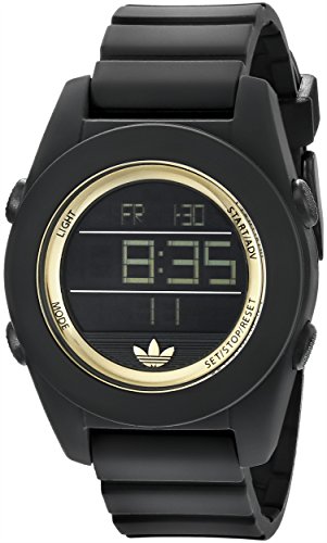 Round watch with plastic case featuring gold-tone dial ring and day and date functions