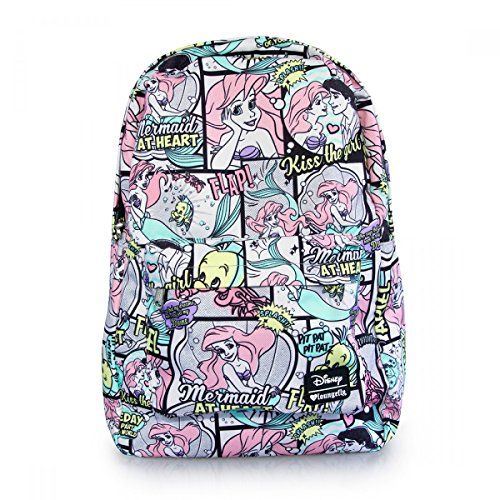 -. Feature : The Beautiful P.R.Incess Ariel / Nylon material with Minnie design, Reinforced Adjustable Straps / Front exterior zippered pocket, Main zippered compartment, Interior laptop sleeve and organizing pockets / 17.5" X 11.5" X 5" / Officially licensed merchandise.