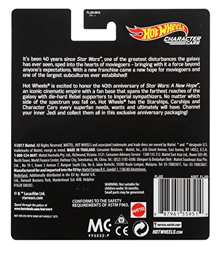 -. Binding : Toy -. Brand : Hot Wheels -. EAN : 0887961559514 -. Feature : The Starships, Carships and Character Cars are individually designed to accurately reflect iconic Star Wars characters, combined with the thrill of Hot Wheels racing excitement / Re-create your favorite storylines / Send the cars flying at light speed on a Hot Wheels Star Wars track set (sold separately) or display them with your other favorite Star Wars collectibles / Makes a great gift for kids, collectors and Star Wars fans of all ages / Collect them all in this exclusive limited edition anniversary packaging! -. IsAdultProduct : 0 -. Label : Mattel -. Manufacturer : Mattel -. Model : FLJ52 -. MPN : FLJ52 -. NumberOfItems : 1 -. PackageQuantity : 1 -. PartNumber : FLJ52 -. ProductGroup : Toy -. ProductTypeName : TOYS_AND_GAMES -. Publisher : Mattel -. Studio : Mattel -. Title : Hot Wheels Star Wars Character Cars 40th New Hope R2-D2 Vehicle -. UPC : 887961559514 -. Warranty : 1 year warranty against manufacturer defects