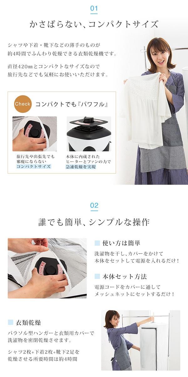 梅雨・悪天候・花粉のシーズンに最適!!かさばらないコンパクトサイズで、操作も洗濯物を干し、カバーをかけて本体をセットして電源を入れるだけとシンプルで簡単です。便利なタイマー機能も付いています。さらに、シャツのしわ取りや靴の乾燥もこれ1台でらくらくです。 |