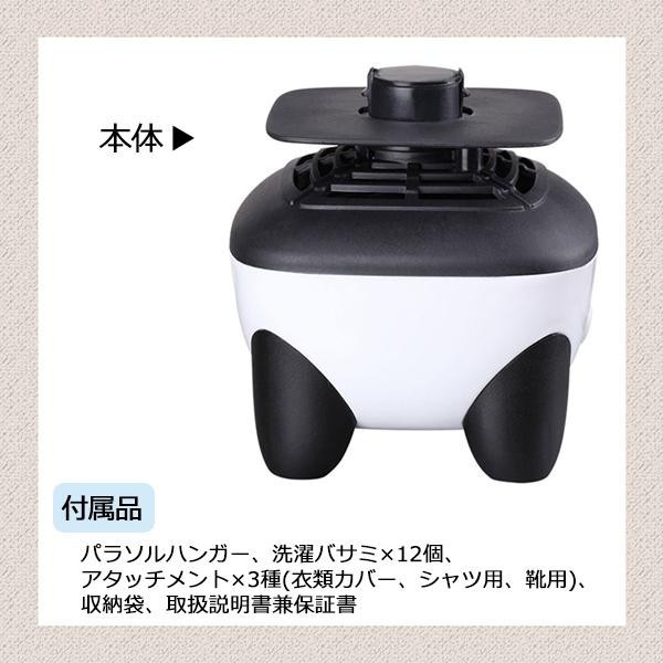 | 付属品 | パラソルハンガー、洗濯バサミ×12個、アタッチメント×3種(衣類カバー、シャツ用、靴用)、収納袋、取扱説明書兼保証書(保証期間:ご購入から1年間) |