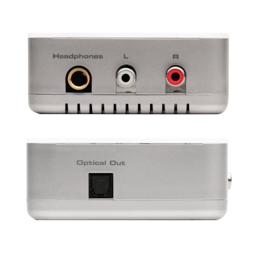 - Outputs 2-channel analog audio via L/R RCA outputs and 1/4-inch headphone jack