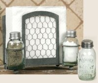-. Binding : Kitchen -. Brand : Colonial Tin Works -. Color : Gray -. Department : Chicken Wire Decor -. EAN : 0793842101683 -. Feature : Features chicken wire on front and back sides. / Includes mason jar shakers. / Napkins and spices not included. -. Label : Colonial Tin -. Manufacturer : Colonial Tin -. Model : 760258T -. MPN : 760258T -. PackageQuantity : 1 -. PartNumber : 760258T -. ProductGroup : Kitchen -. ProductTypeName : KITCHEN -. Publisher : Colonial Tin -. Studio : Colonial Tin -. Title : Chicken Wire Salt Pepper and Napkin Caddy -. UPC : 801106142812