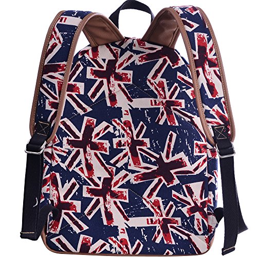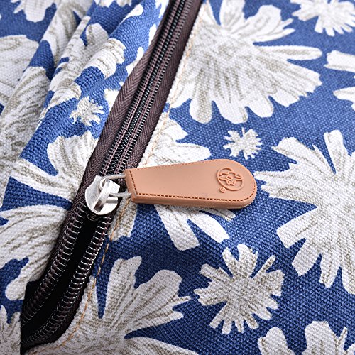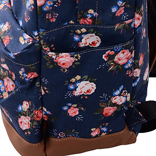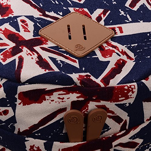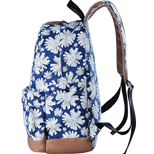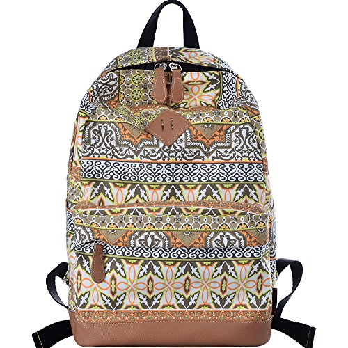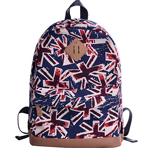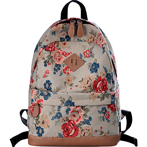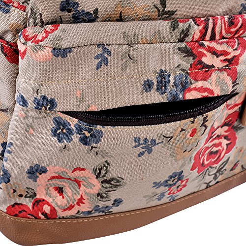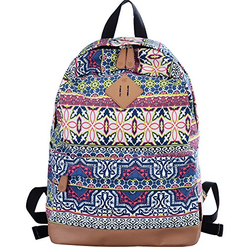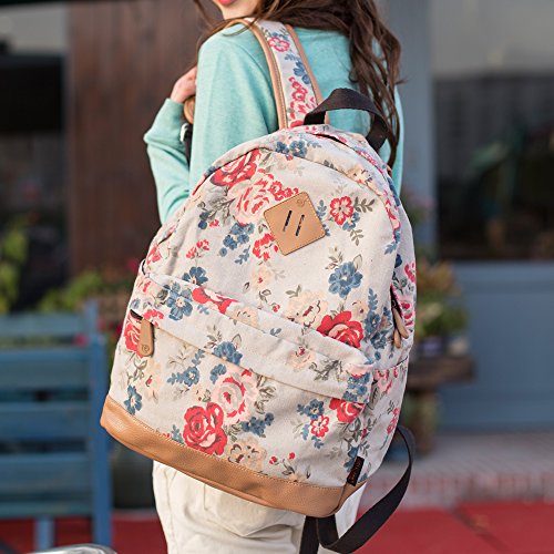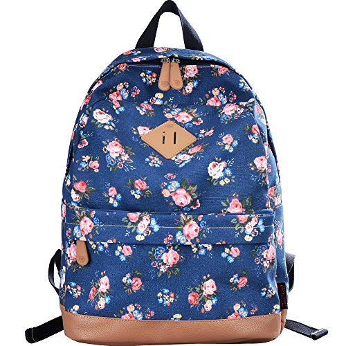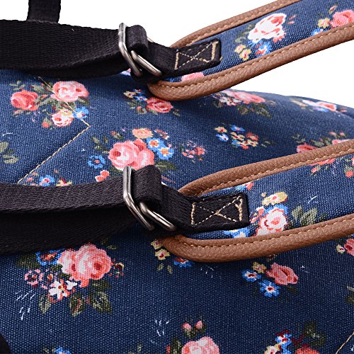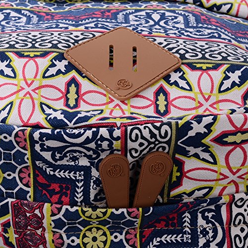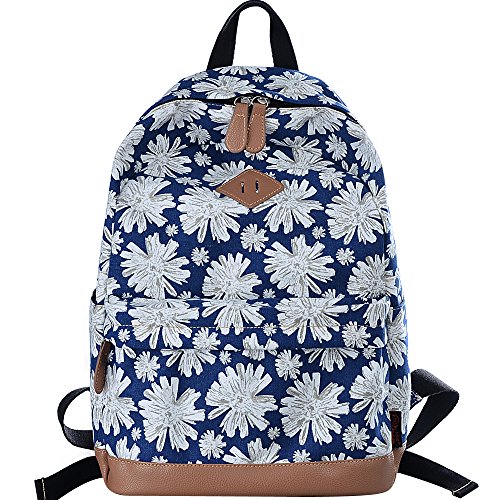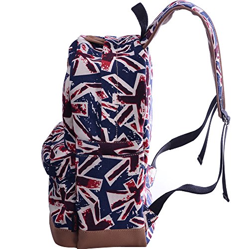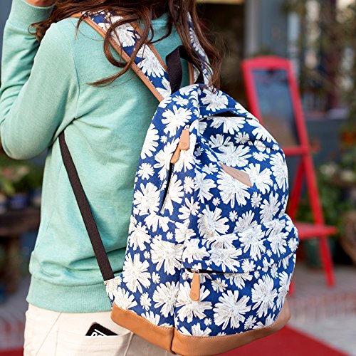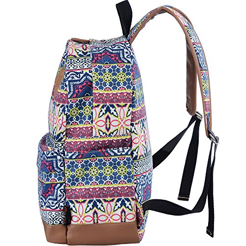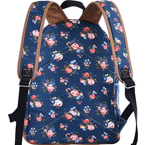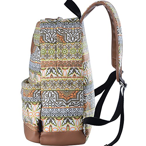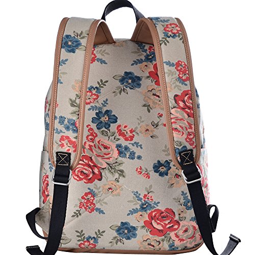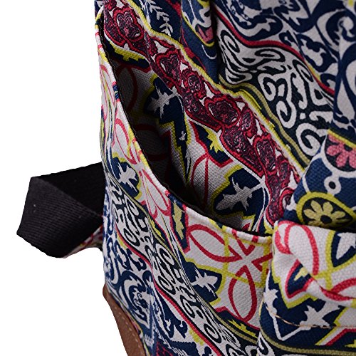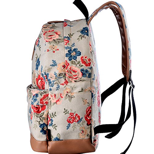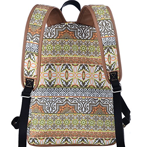 - Feature : Durable and sturdy printing canvas backpack with faux leather bottom / Single carry strap at top with two adjustable shoulder straps for versatility / Spacious main compartment can hold books, clothes, or other daily essentials. / Interior features two slip pockets and two side pockets for organization, the interior laptop sleeve can hold up to a 14-inch laptop / Front zip pocket for additional storage, two slip pockets at sides to hold water bottles or other items for those fun-filled days outside