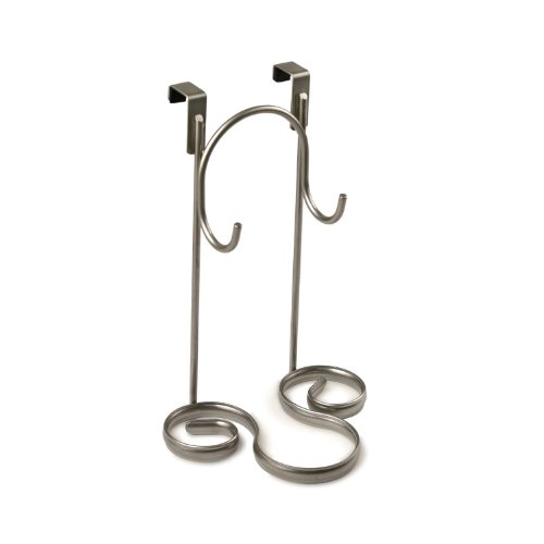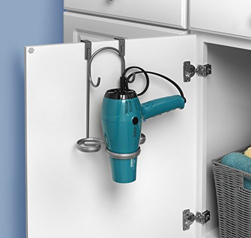 Organize your hair-care tools with Spectrum's Ashley Over the Cabinet Door Styling Rack. Great for bathroom clutter-control, this organizer easily slides over standard cabinet doors to keep your essential hair styling tools conveniently at your fingertips. Made of sturdy steel, the unique design neatly stores your flat iron, hair brushes and hair dryers with nozzles up to 2-3/4" wide. Two hooks provide storage for a curling iron or cord organization. Satin nickel powder coat. Measures 6.00"Depth X 6.75"Width X 10.00"Height.