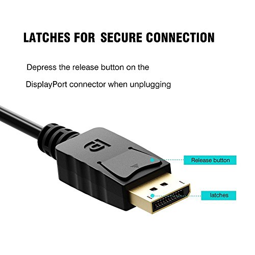 SUPERIOR CONSTRUCTION WITH A HINT OF COLOR - It combines gold-plated connectors with molded strain relief resist corrosion, provide durability and improve the signal transmission. Foil and braid shielding provides protection against EMI and RFI noise. DisplayPort connector with latches provides a secure connection with a release button that must be depressed before unplugging to prevent accidental disconnections.